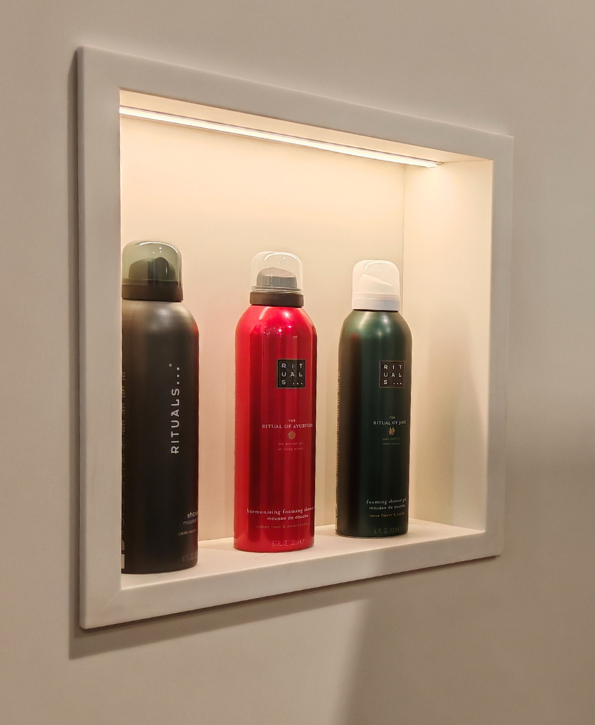 Een strak geïntegreerde opbergnis met subtiele LED-verlichting. De verfijnde opvolger van onze Art Box, ontworpen voor badkamers, douches en wellnessruimtes waar sfeer net zo belangrijk is als functionaliteit.